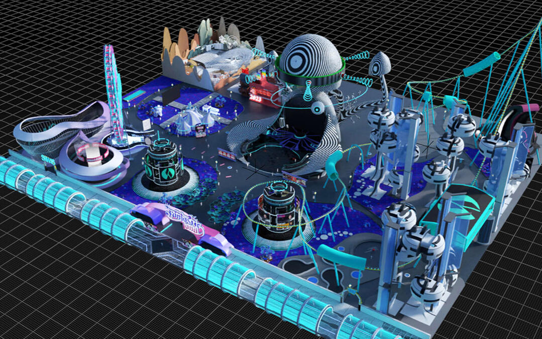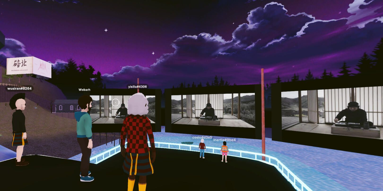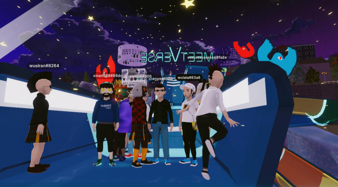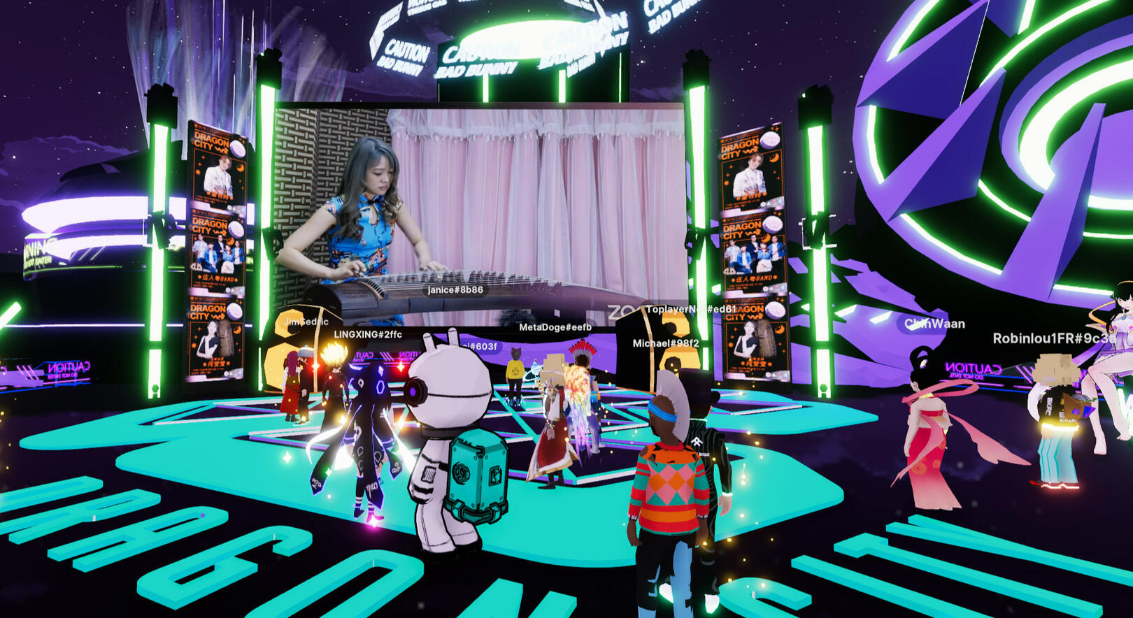 Meetverse Party is an immersive online music event hosted in Dragon City. During this unique online party experience, participants can generate spontaneous sounds through interactions with one another. These off-stage sound snippets synchronize with the music playing on the main stage and are then captured by a 'collective radio' within this virtual universe. This innovative approach aims to decentralize the authority to produce sounds typically held by the main stage, resulting in a captivating and dynamic 'soundscape' for all to enjoy.